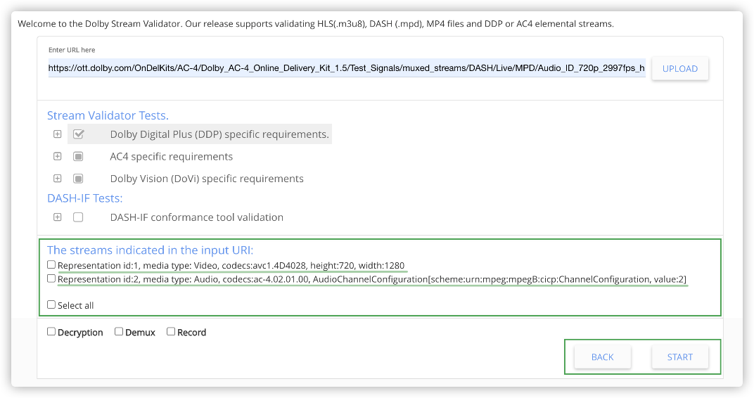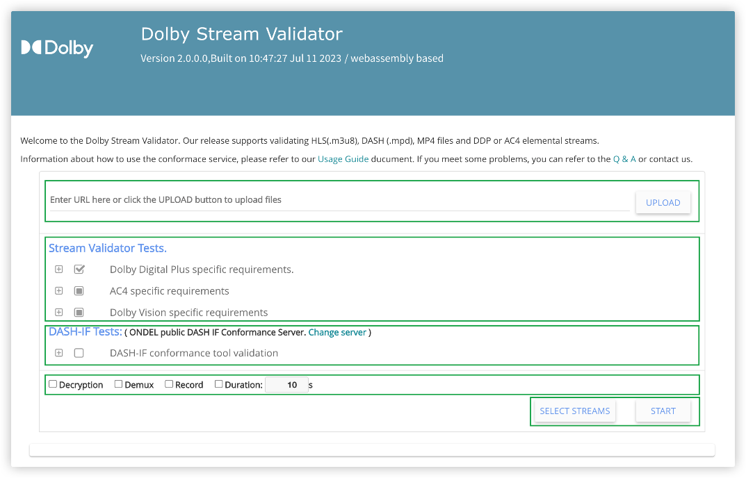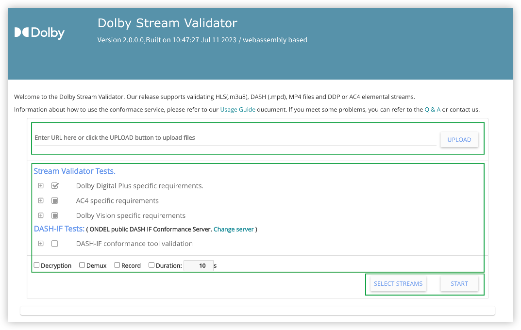 For validation options, StreamValidator provides the validation checking whether your input contents conformance to our Dolby specs, in the StreamValidator checkpoints field, you can click the checkboxes in the validation options field to edit the requirements set based on the content you input and the environment where you want to play your content.