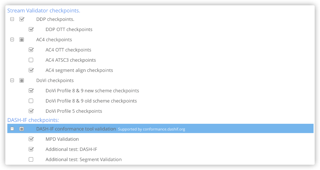 Besides, StreamValidator also provides some validation testings from DASH-IF conformance tool, you can choose them in the DASH-IF checkpoints field where you can edit your test plan in DASH IF conformance tool.