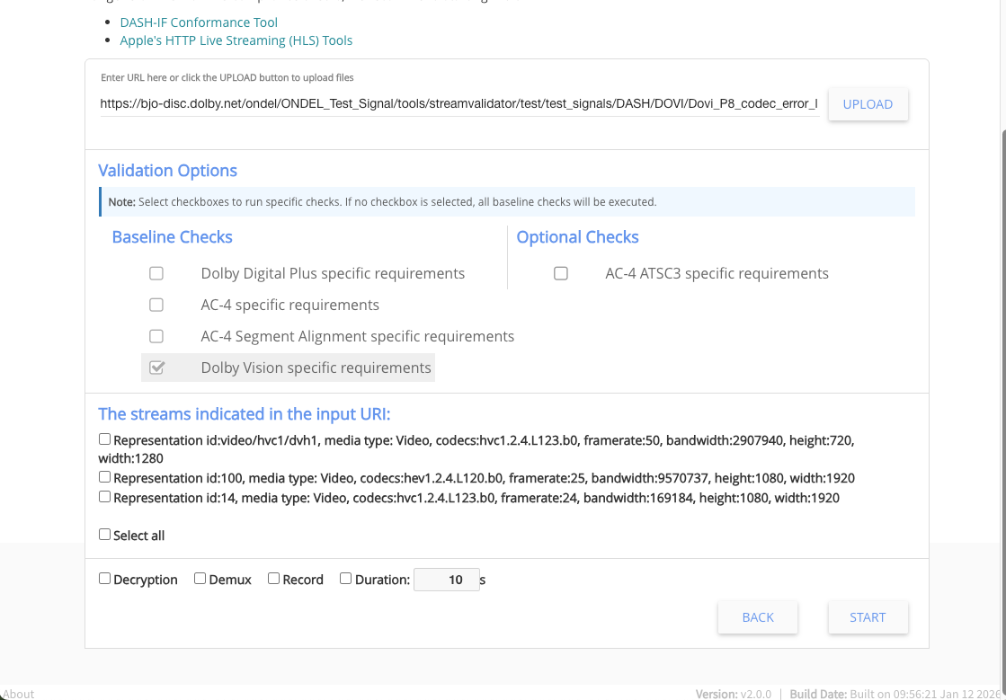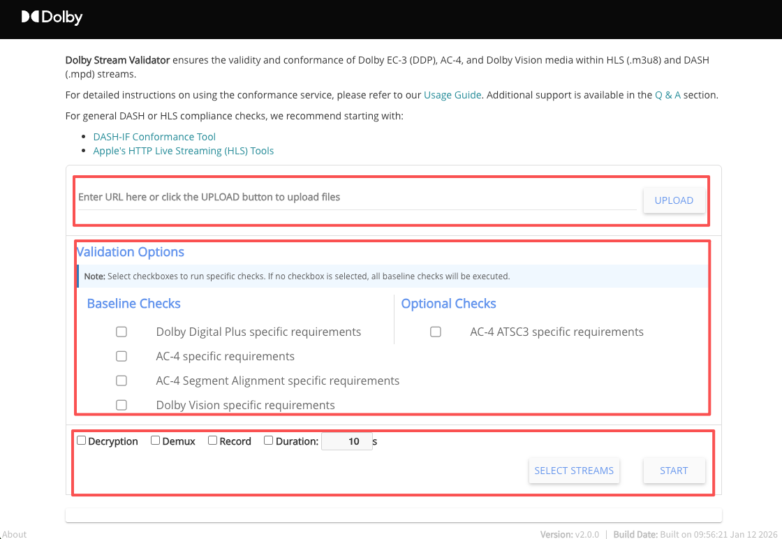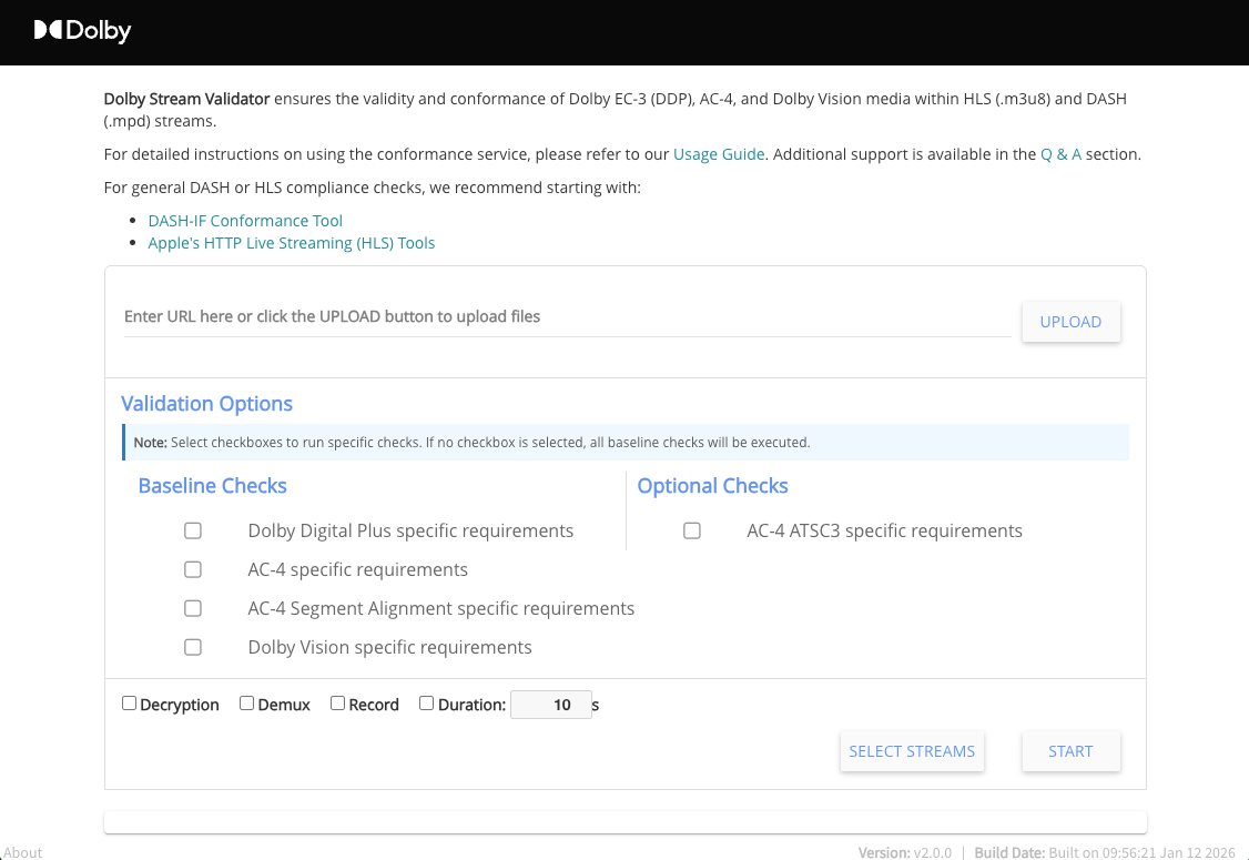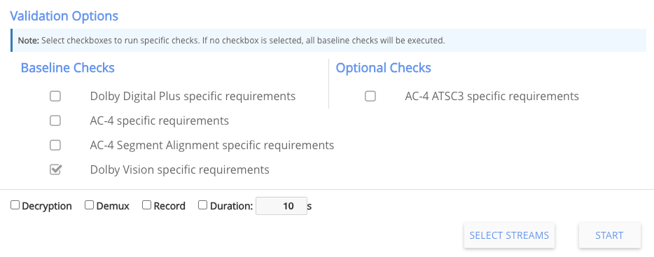 Baseline Checks: These include core Dolby requirements for Dolby Digital Plus, AC‑4, AC‑4 Segment Alignment, and Dolby Vision. If no checkboxes are selected, all baseline checks will be executed automatically with additional default validations (checkpoints 310000, 330000, 410000, 430000).