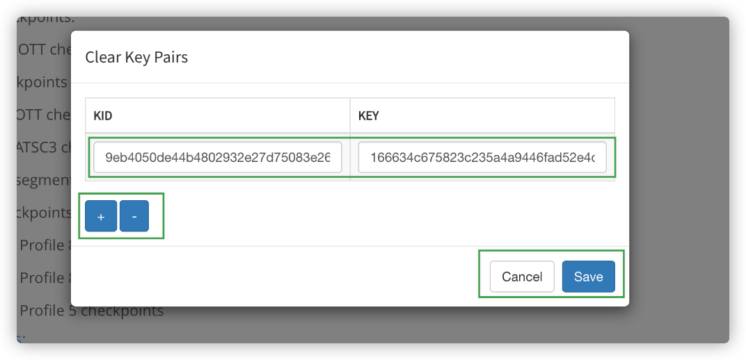 You can click the checkbox in front of the Decryption to set the decryption key and value for your encrypted content. After you click the checkbox, a new window will show up to let you add decryption key-value pairs on your input: you can click the plus icon to add a new key-value pair, click the minus icon to delete the bottom key-value pairs, and edit the key-value pairs in the middle input box. Finally, you can click the save button to save the key-value pairs you have edited, if you click the cancel button, that means you don't need open the decryption function, all the decryption key-value pair will be saved but disabled: