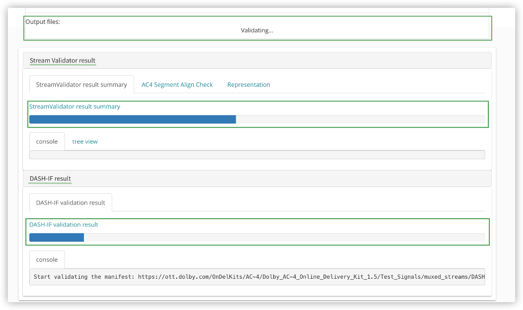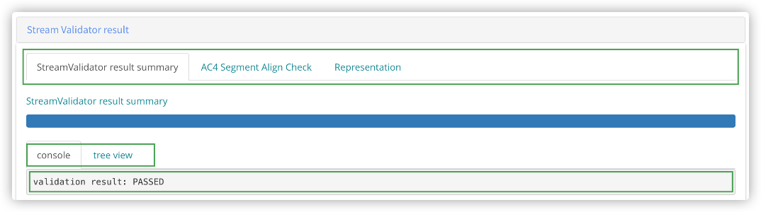 2. StreamValidator validation result: The StreamValidator validation result consists of the result for manifest/playlist attributes validation (if the input is DASH manifest or HLS playlist), the results for the validation checking the conformance between the information of each level describing the same stream (for example, if your input is DASH manifest, StreamValidator will check the Representation-level information, the MP4-level information and the elemental stream level information in each Representations) and the results for specific content (such as, for AC4 content, StreamValidator will check the AC4 related A/V segments alignment for your input, and for AC4 or DDP content, StreamValidator will check whether the elemental stream in the input media files conforms to our Dolby requirements.)